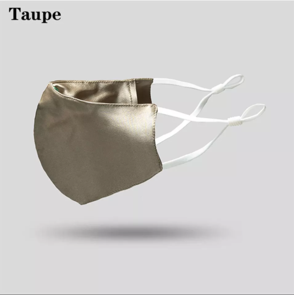 Seidenmasken aus Maulbeerseide taupe mit 1 Filter PM 2.5 mit hohem Tragekomfort / waschbar von Hand bei 30° Celsius.